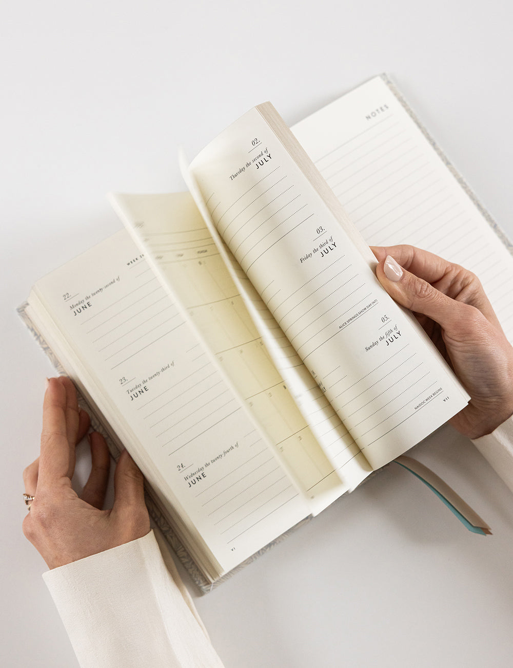 Our planners aren’t just beautifully designed, they’re deeply considered. Every element, from layout to finish, is intentionally crafted by our in-house designers with care, purpose, and attention to detail. Nothing is accidental. From the luxurious heavyweight paper to the elegant gold foil accents and thoughtfully structured pages, each feature is designed to not only look stunning but to enhance your daily life. It’s a planner that feels as good as it functions - refined, purposeful, and made to inspire all year long.