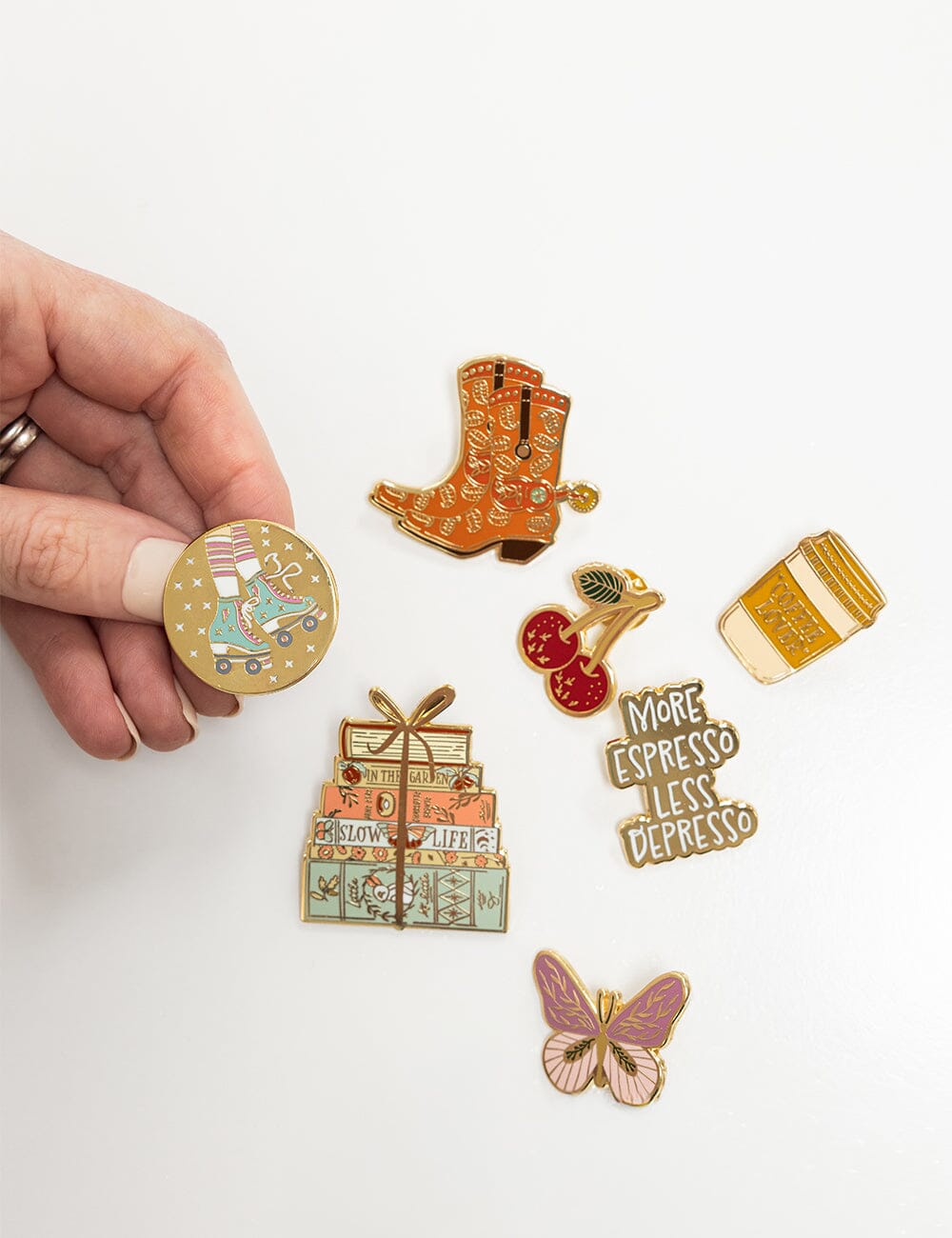 Hard fine enamel (Faux Cloisonné) pin, packaged on a gold fold card and inside of a biodegradable clear bag.