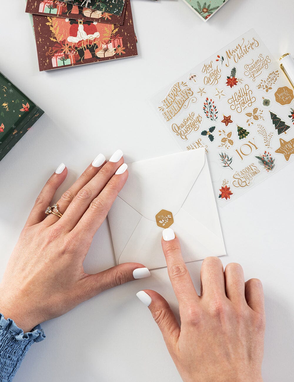 "Christmas Greetings" gold foil accented sticker sheets are designed to bring festive charm and joy to your holiday celebrations. Whether you're decorating gift wrap, sending heartfelt cards, or adding holiday cheer to your journal, these stickers add a touch of elegance and warmth to every detail.