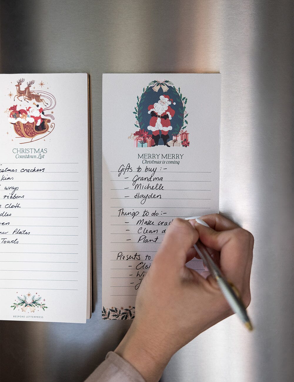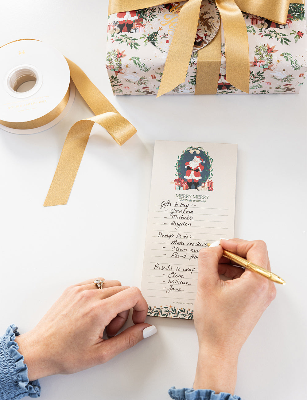 30 lined tear off gummed notepad pages with gold foil printed bellyband, gold gilded edges, heavy duty boxboard base and magnet to the rear.