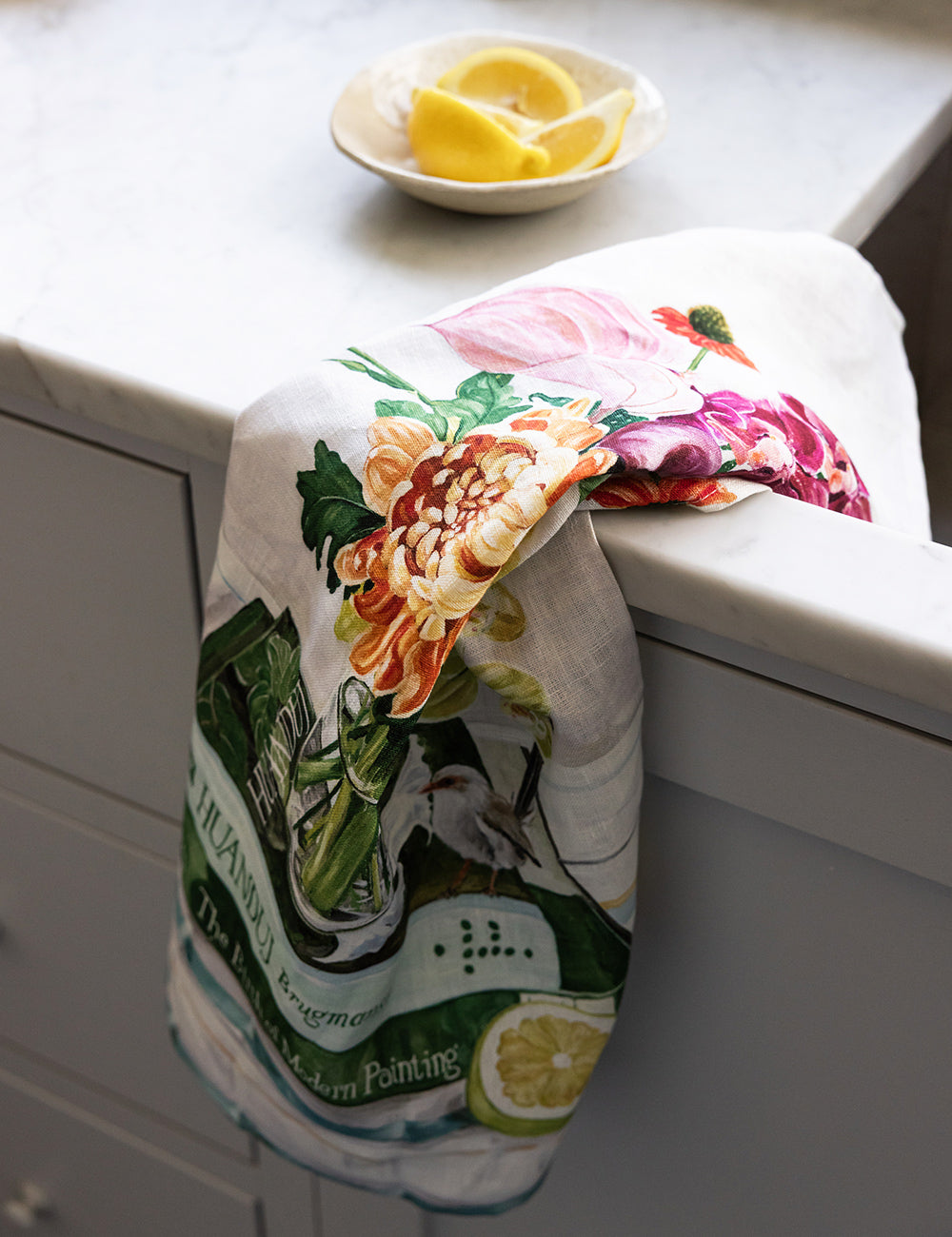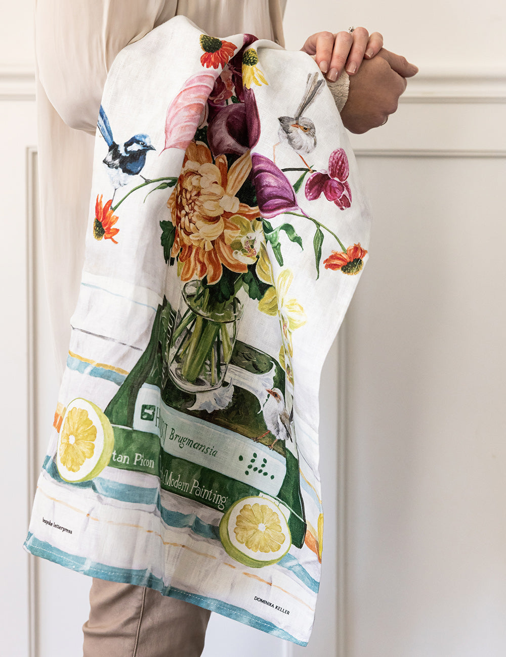 Artwork by Dominika Keller and printed on 100% Linen Tea Towel. Supplied folded with a gold foil printed removable bellyband.