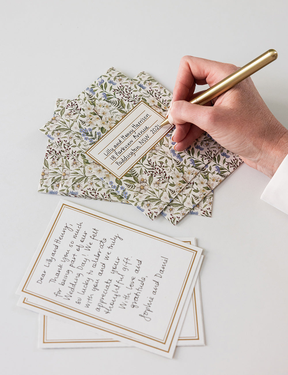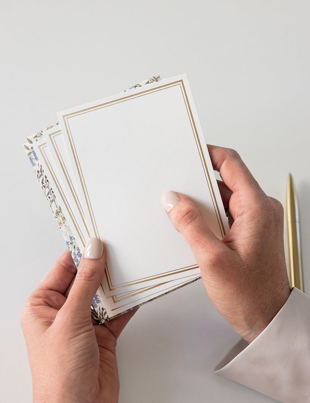 - Envelopes feature gold-foiled address box on front and a beautiful scalloped flap.