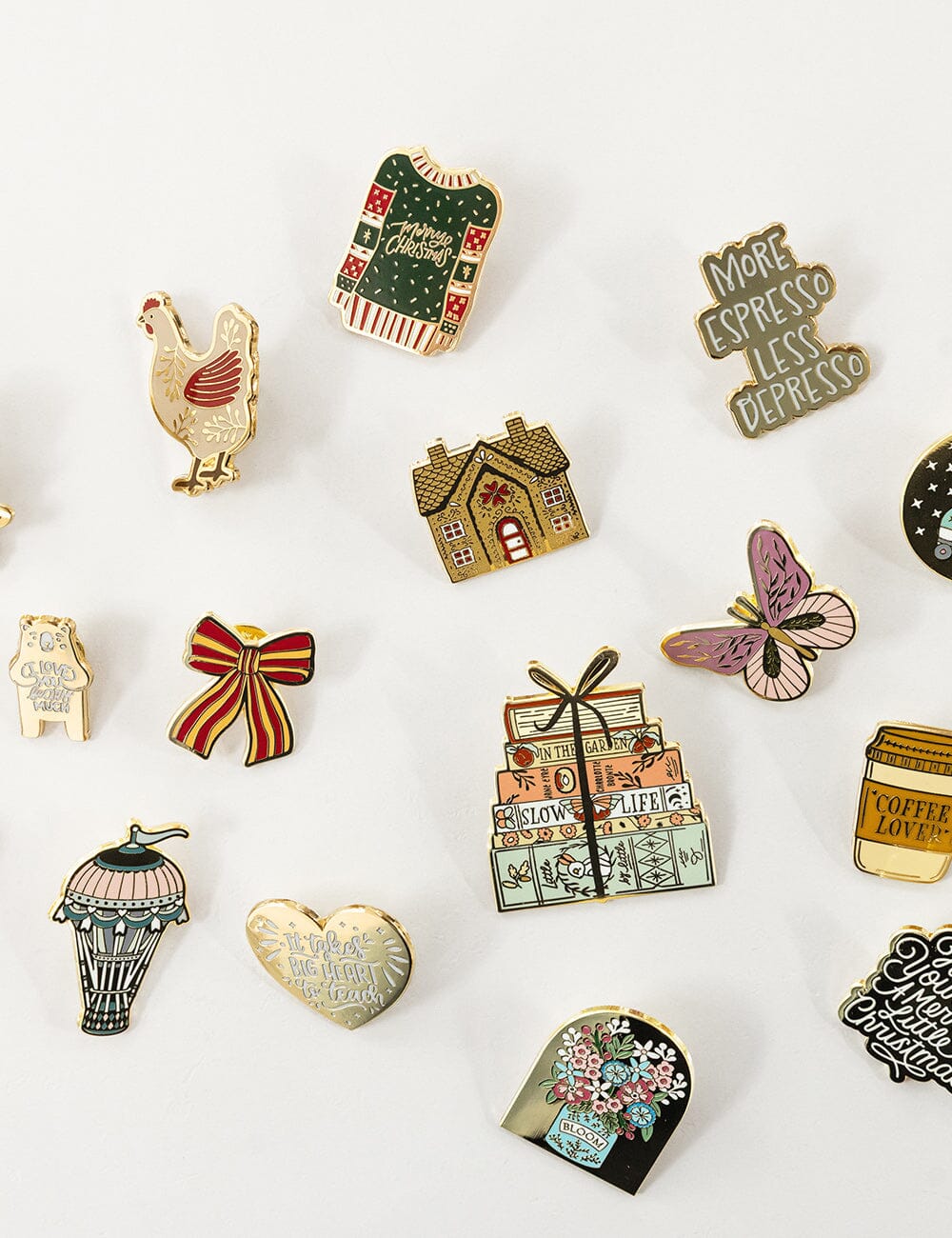 Hard fine enamel (Faux Cloisonné) pin, packaged on a gold fold card and inside of a biodegradable clear bag.