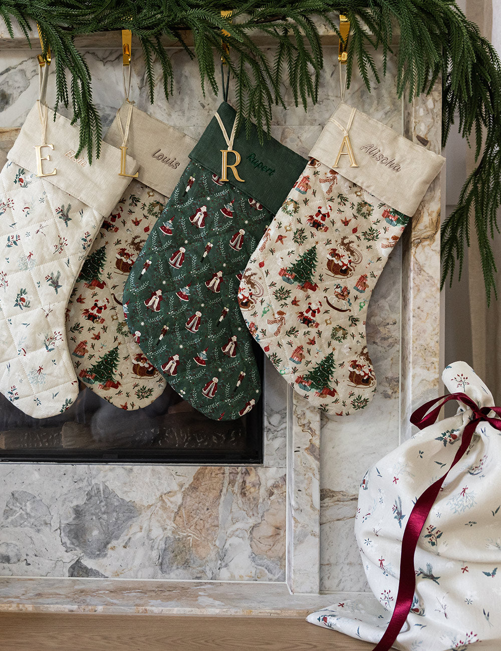 Illustrations by Maja Lindberg and printed on 100% Linen. Our Heirloom Quilted Mr & Mrs Claus stocking has a printed sock and plain linen cuff. Supplied with a gold foil printed removable swing tag.