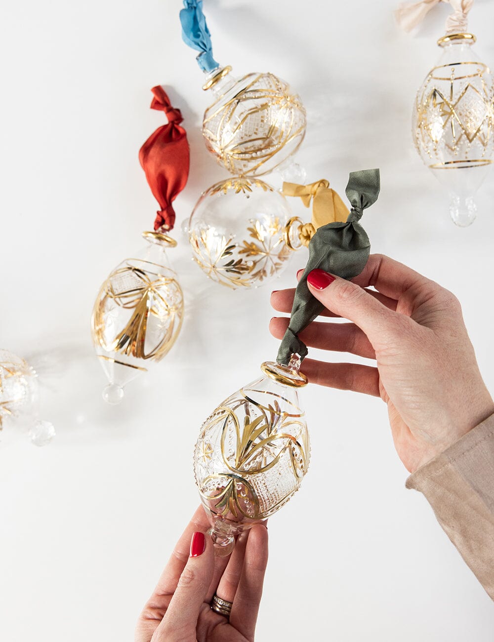 The ornaments are then engraved by hand with the pattern, and are craftsman hand painted with concentrated 10% pure liquid gold, then heated in a furnace at approximately 500'c to set this gold into the design.