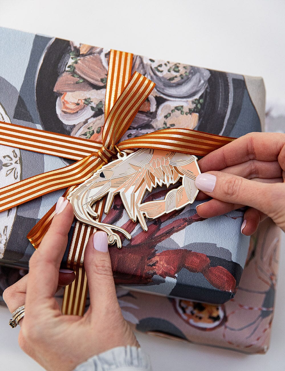 Fine enamel Christmas Prawn ornament, complete with fine gold line ribbon.