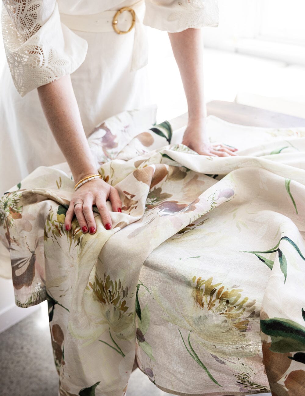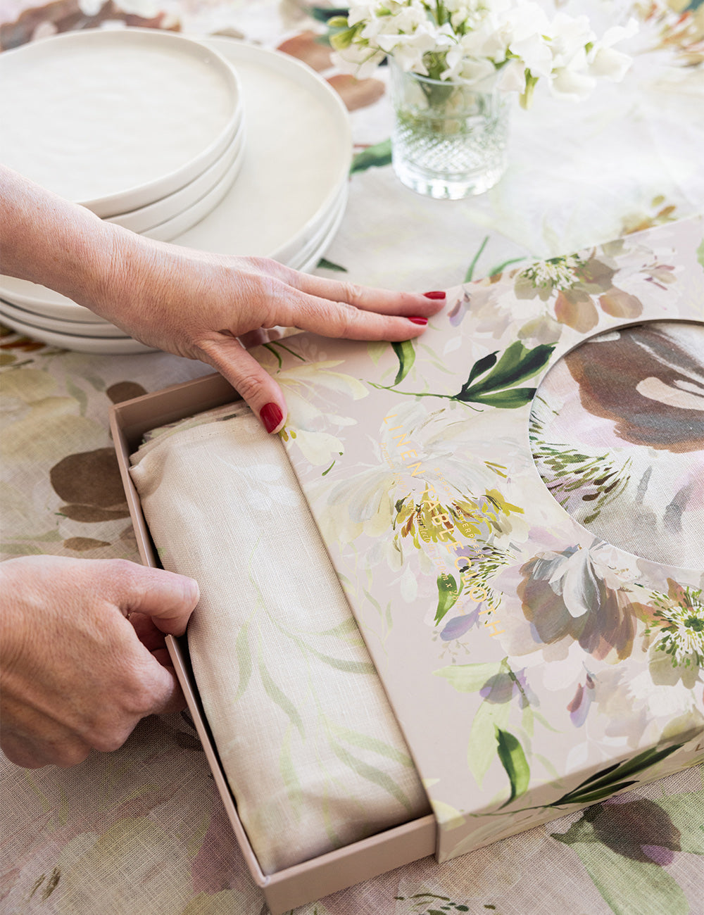 Artwork by Kelly Ventura and printed on 100% Linen Tablecloth. Supplied folded and housed inside of a heavyweight gold foiled keepsake gift box.