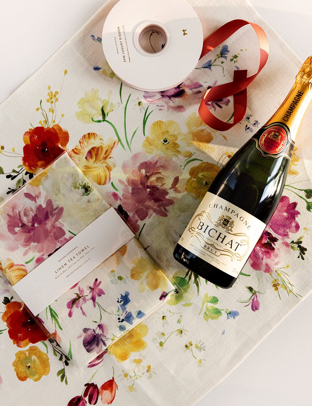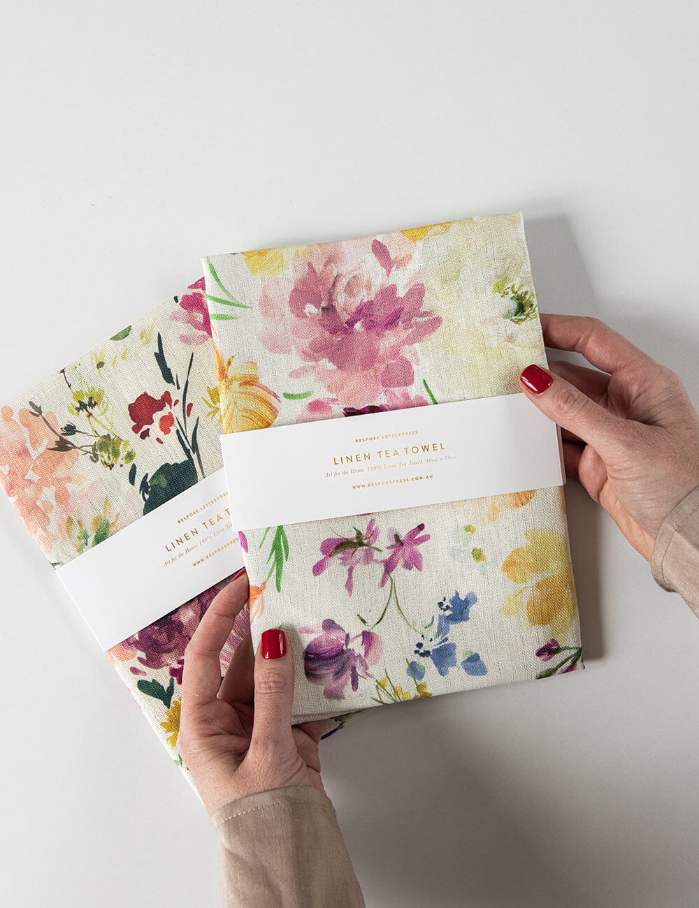 Artwork by Kelly Ventura and printed on 100% Linen Tea Towel. Supplied folded with a gold foil printed removable bellyband.
