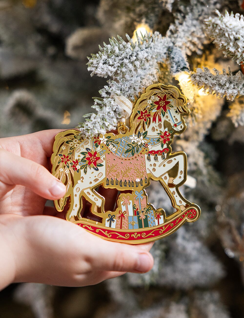 Fine enamel Christmas Rocking Horse ornament, complete with fine gold line ribbon.