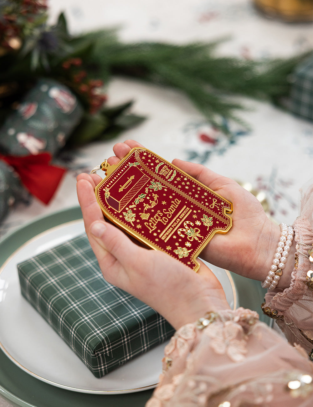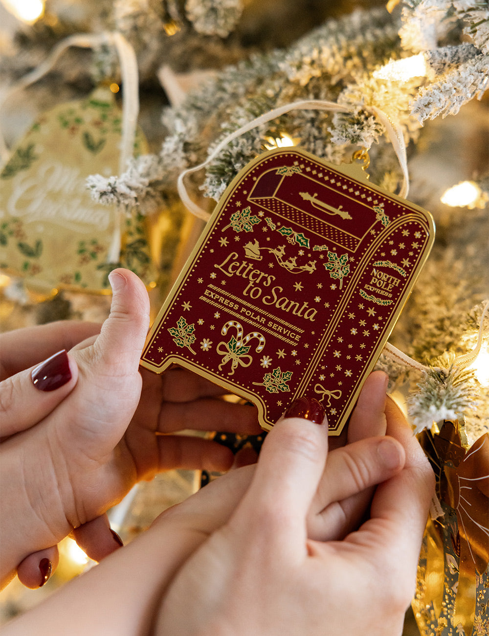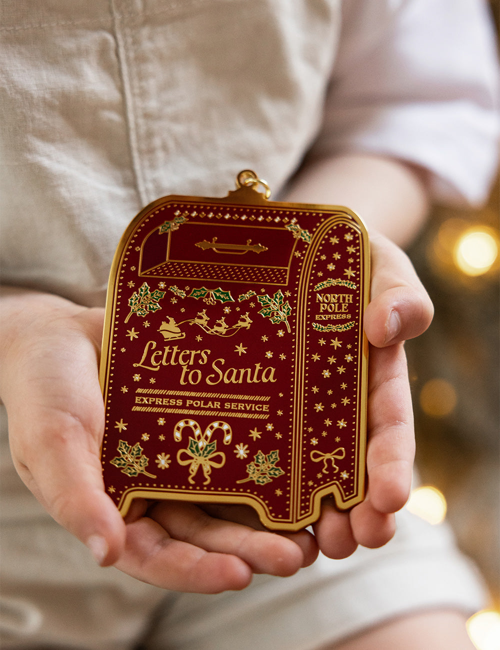 Fine enamel Santa's Mailbox ornament, complete with fine gold line ribbon.