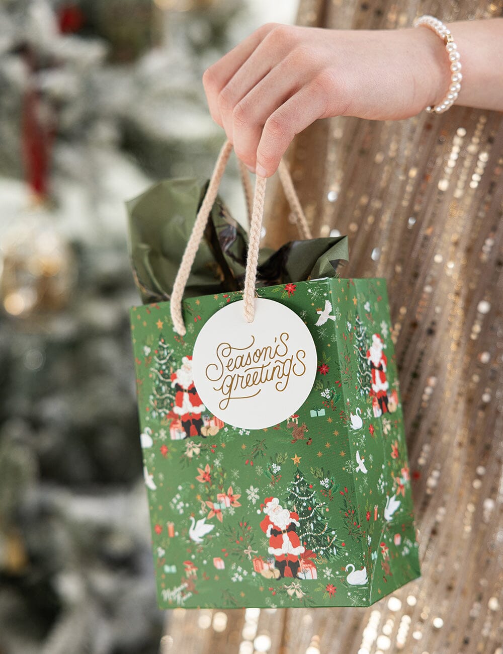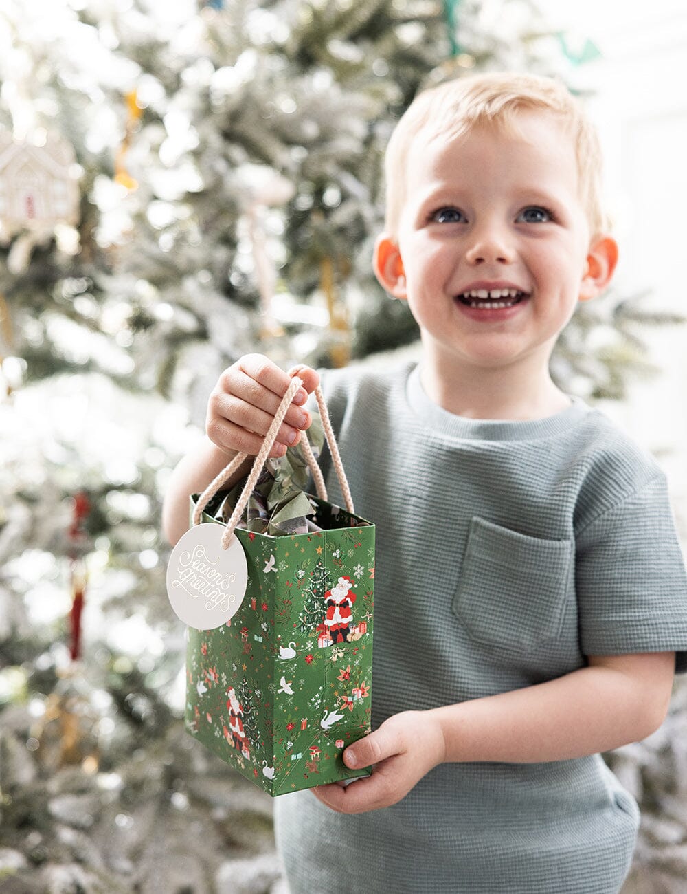 Small Santas Wonderland gift bag with gold foil printed tag and hand dyed rope handle.