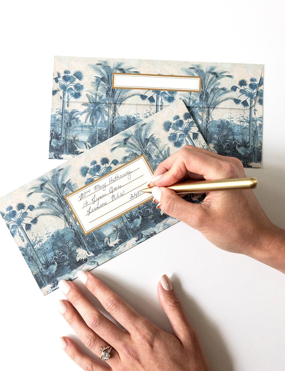 Gold foiled address box to front and return to sender address box to rear.