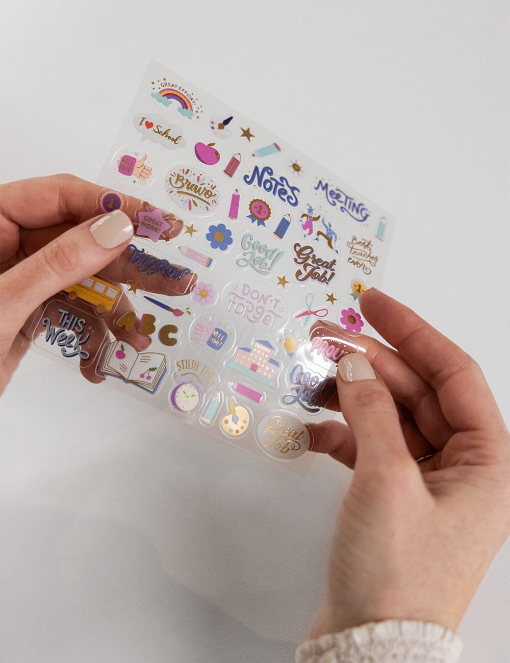 Each pack contains 1 page of stickers, which have been beautifully foil printed on clear heavyweight adhesive stock.